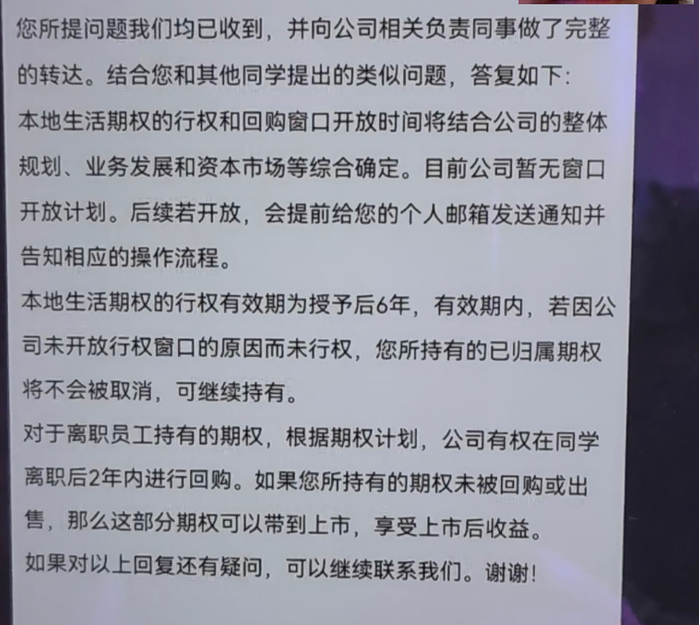 但对此,一名前员工并不满意。“这只是把员工支付的行权款退了,但是期权仍然不回购。”
