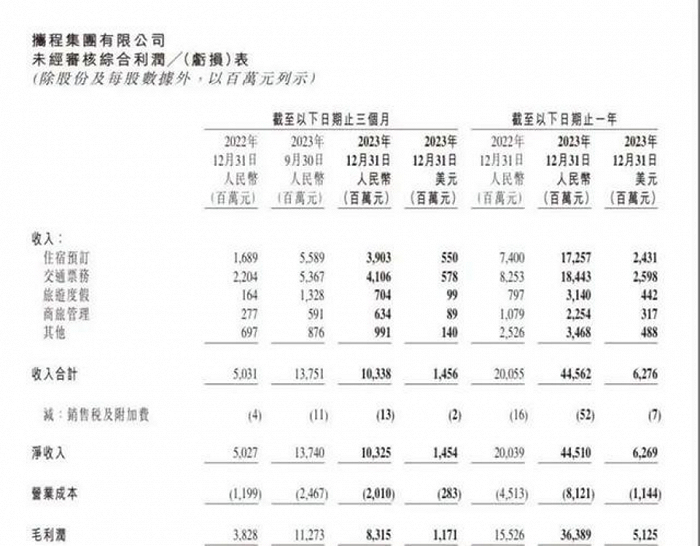 2024年2月22日,携程集团公布了2023年第四季度及全年未经审计的财务业绩,营收、净利润,及核心业务均实现较大幅度的同比增长。公布当日,携程港股当日股价涨了7.3%,美股也涨超7%。