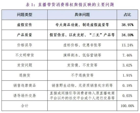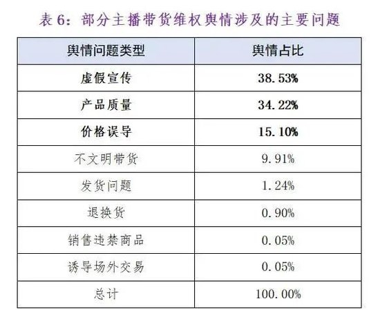《报告》中指出,2023年直播带货消费维权舆情主要反映出虚假宣传、产品质量、价格误导、不文明带货、发货问题、退换货、销售违禁商品以及诱导场外交易等八方面问题。虚假宣传已上升为直播带货的首要问题。