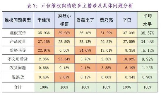与2022年相比,李佳琦、疯狂小杨哥等主播的产品质量和不文明带货舆情比例都有所上升,而他们的虚假宣传问题舆情有所下降,新增加4位主播有两位进入维权舆情前五,问题也较为突出。