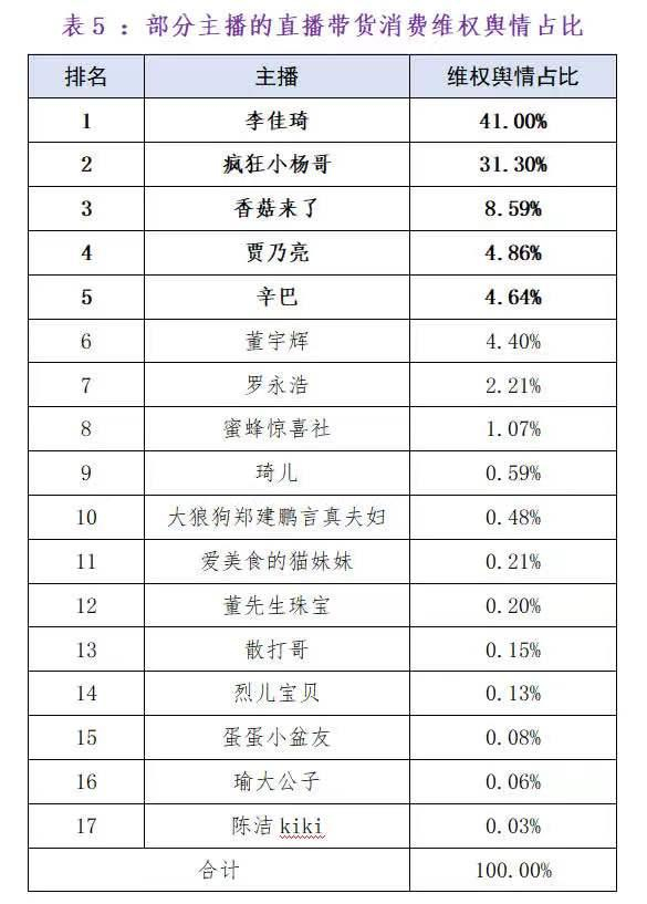 3月14日,北京阳光消费大数据研究院、北京工商大学新商业经济研究院、中新经纬研究院、消费者网联合发布了《直播带货消费维权舆情分析报告(2023)》。报告分析显示,2023年直播带货消费维权舆情主要反映出虚假宣传、产品质量、价格误导、不文明带货、发货问题、退换货、销售违禁商品以及诱导场外交易等八方面问题,其中,虚假宣传问题排名第一。报告还分析了17位主播2023年的直播带货消费维权舆情。其中,李佳琦维权舆情最多,占比41.00%,相比2022年增长11.79%。
