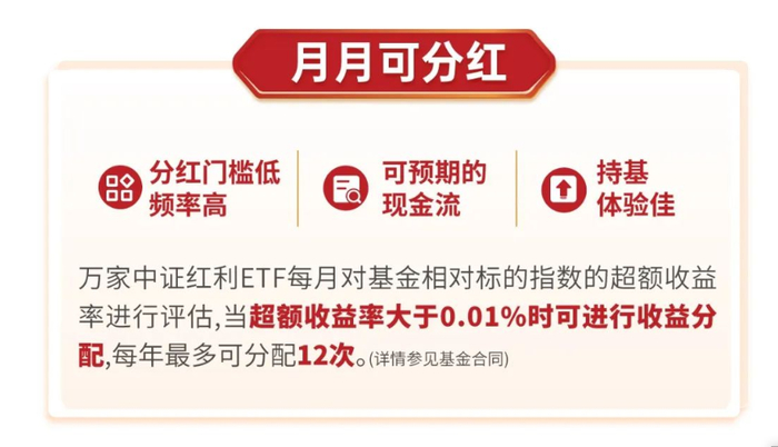 此前,摩根中证A50ETF设定,在超额收益为正时,按季度强制分红,一年分红最多4次。3月15日,万家中证红利ETF即将迎来上市交易,该基金设定了“月月可分红”的机制,每年分红最多可达12次。