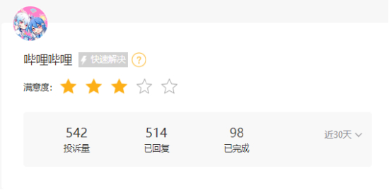 新浪黑猫投诉平台数据显示,截至2024年3月14日,哔哩哔哩共收到投诉542件,已回复514件,回复率94.8 %;已完成98件,完成率18.1%。