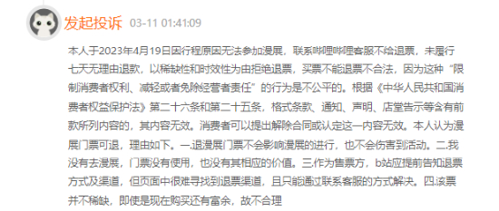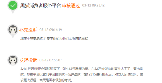 有投诉者表示,3月4日在哔哩哔哩会员购购买了一张4月13号漫展的票,在3月6号突发临时事件去不了,要求退款,却被平台以它们平台的条款不允许退款,在12315进行投诉后,对方无所谓投诉。
