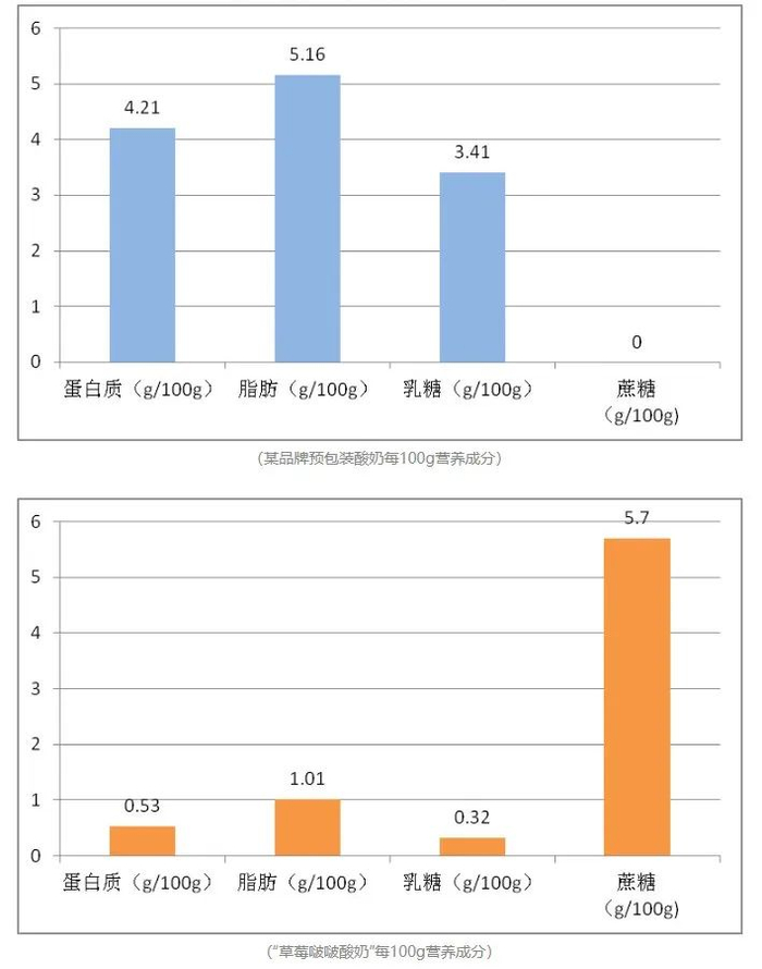 也就是说,每100g产品中,预包装酸奶蛋白质含量是书亦烧仙草样品的7.9倍,脂肪含量为5倍,乳糖含量为10倍。