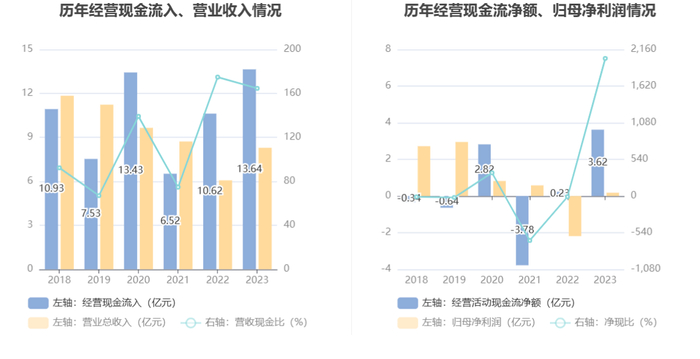 2023年,公司经营活动现金流净额为3.62亿元,同比增长1451.62%;筹资活动现金流净额7919.59万元,同比增加2.14亿元;投资活动现金流净额-8402.62万元,上年同期为100.21万元。