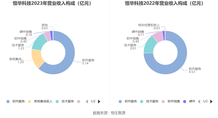 分产品来看,2023年公司主营业务中,软件服务收入5.14亿元,同比增长13.45%,占营业收入的62.06%;系统集成收入收入1.29亿元,占营业收入的15.55%;技术服务收入1.25亿元,同比增长37.61%,占营业收入的15.04%。