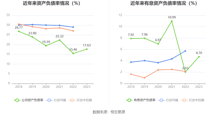在偿债能力方面,公司2023年年末资产负债率为17.63%,相比上年末上升2.07个百分点;有息资产负债率为4.70%,相比上年末上升2.67个百分点。