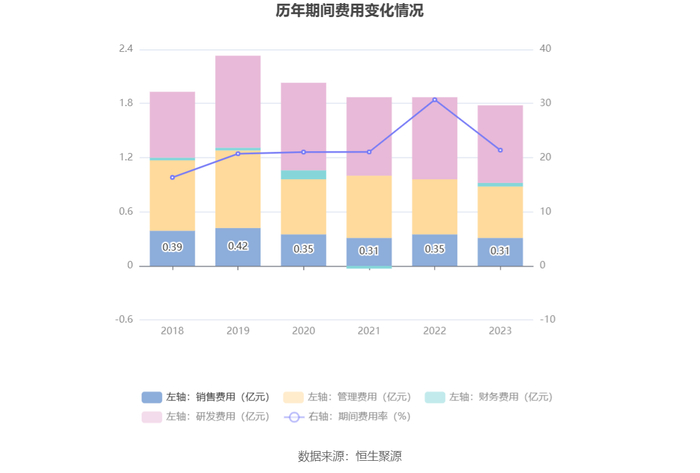 2023年,公司期间费用为1.77亿元,较上年同期减少926.43万元;期间费用率为21.38%,较上年同期下降9.32个百分点。其中,销售费用同比下降10.43%,管理费用同比下降6.74%,研发费用同比下降6.29%,财务费用由去年同期的-36.18万元变为382.82万元。