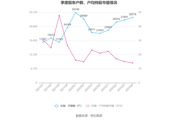 筹码集中度方面,截至2023年年末,公司股东总户数为2.86万户,较三季度末增长了1087户,增幅3.95%;户均持股市值由三季度末的15.21万元下降至14.19万元,降幅为6.71%。