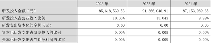 2023年全年,公司研发投入金额为8561.85万元,同比下降6.29%;研发投入占营业收入比例为10.33%,相比上年同期下降4.71个百分点。此外,公司全年研发投入资本化率为0。