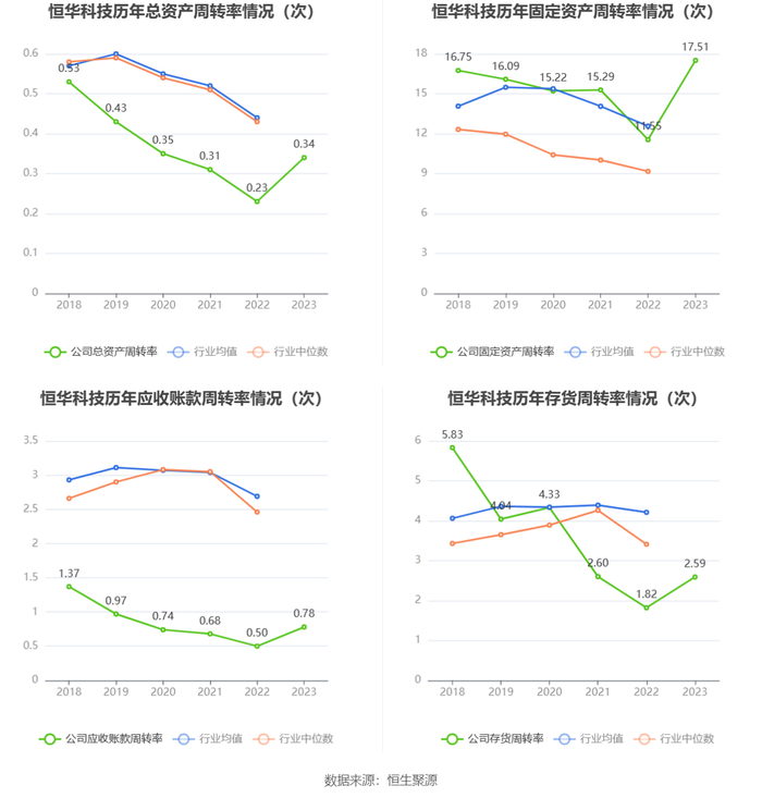 营运能力方面,2023年,公司公司总资产周转率为0.34次,上年同期为0.23次(2022年行业平均值为0.44次,公司位居同行业91/103);固定资产周转率为17.51次,上年同期为11.55次(2022年行业平均值为12.57次,公司位居同行业41/103);公司应收账款周转率、存货周转率分别为0.78次、2.59次。