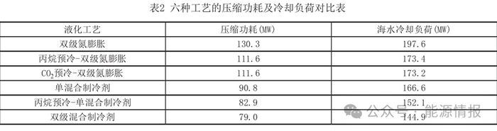 以FLNG处理规模为300万吨/年为例,通过HYSYS模型计算了六种工艺的压缩功耗及冷却负荷,如表2所示。
