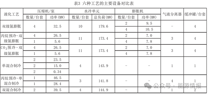 由以上对比结果表明:双级混合制冷剂工艺压缩功耗最低,双级氮膨胀工艺压缩功耗最大。六种工艺的主要采用的设备对比如下: