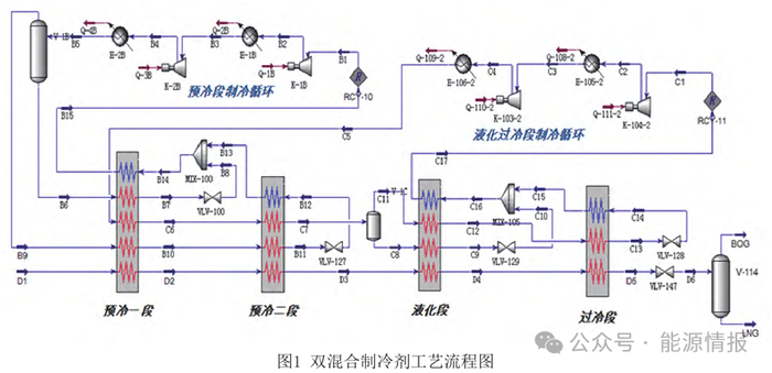 该工艺流程分三部分:天然气预冷、液化、过冷部分;预冷段制冷循环;液化过冷段制冷循环。