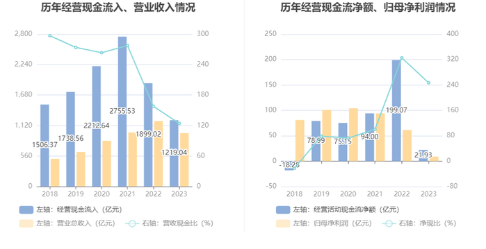 2023年,公司经营活动现金流净额为21.93亿元,同比下降88.99%;筹资活动现金流净额-312.15亿元,同比减少34.72亿元;投资活动现金流净额33.16亿元,上年同期为-24.07亿元。