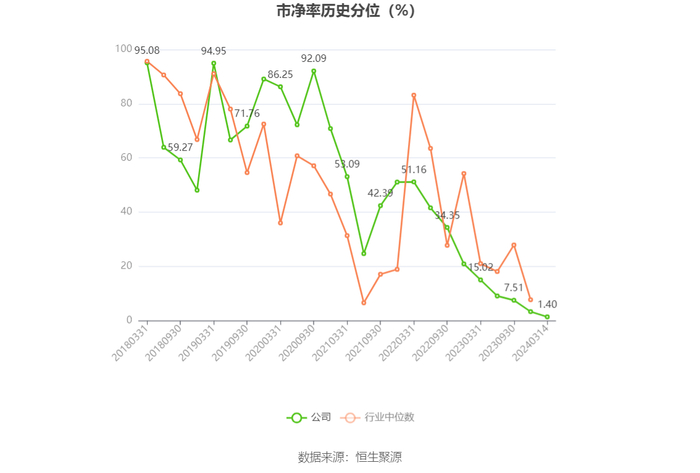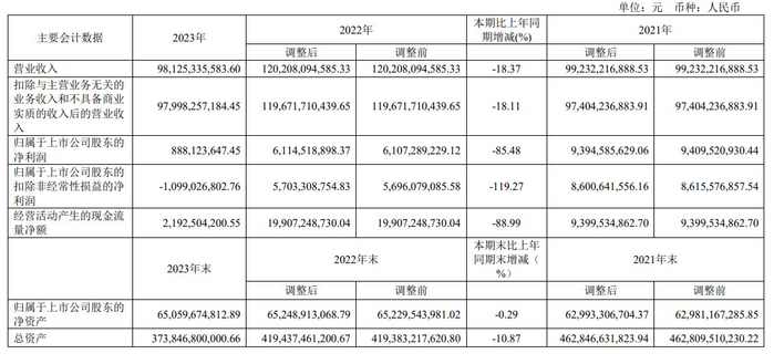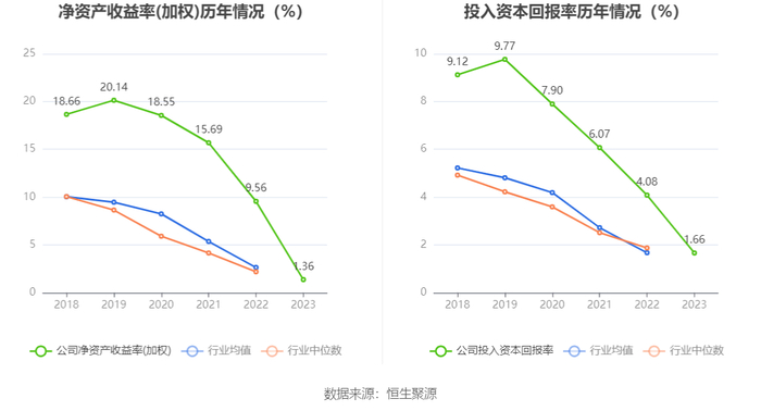 数据显示,2023年公司加权平均净资产收益率为1.36%,较上年同期下降8.20个百分点;公司2023年投入资本回报率为1.66%,较上年同期下降2.42个百分点。