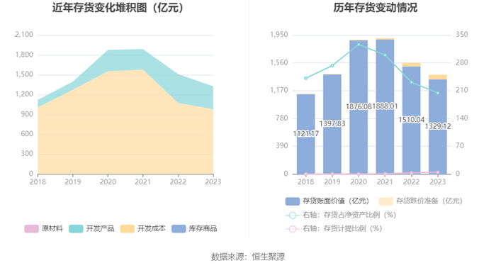 从存货变动来看,截至2023年年末,公司存货账面价值为1329.12亿元,占净资产的204.29%,较上年末减少180.91亿元。其中,存货跌价准备为64.96亿元,计提比例为4.66%。