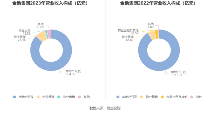 分产品来看,2023年公司主营业务中,房地产开发收入854.69亿元,同比下降21.72%,占营业收入的87.10%;物业管理收入77.48亿元,同比增长16.31%,占营业收入的7.90%;物业出租收入15.88亿元,同比增长29.22%,占营业收入的1.62%。