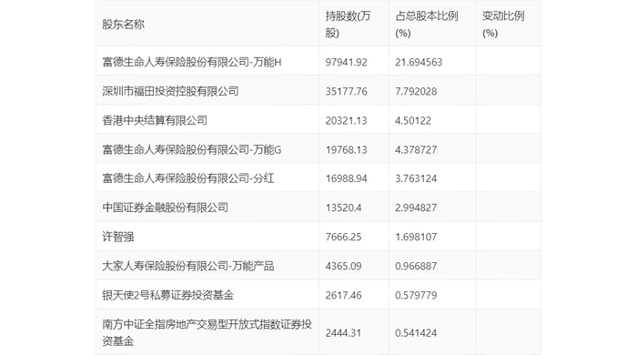 年报显示,2023年年末公司十大流通股东中,新进股东为许智强、银天使2号私募证券投资基金、南方中证全指房地产交易型开放式指数证券投资基金,取代了三季度末的华夏人寿保险股份有限公司-自有资金、中信证券股份有限公司-社保基金1106组合、易方达稳健收益债券型证券投资基金。在具体持股比例上,香港中央结算有限公司持股有所上升,大家人寿保险股份有限公司-万能产品持股有所下降。