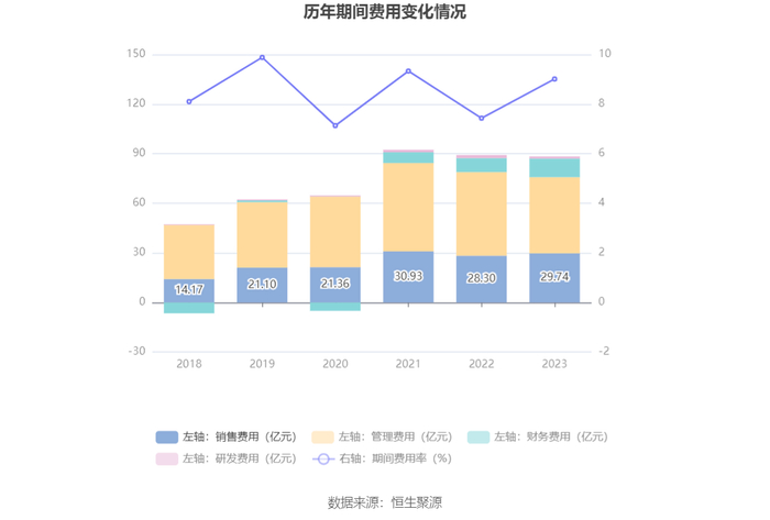 2023年,公司期间费用为88.28亿元,同比减少8784.71万元;但期间费用率为9.01%,同比增长1.58个百分点。其中,销售费用同比增长5.06%,管理费用同比下降8.88%,研发费用同比下降32.66%,财务费用同比增长32.92%。