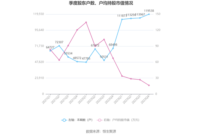 筹码集中度方面,截至2023年年末,公司股东总户数为11.95万户,较三季度末增长了5571户,增幅4.89%;户均持股市值由三季度末的27.02万元下降至16.47万元,降幅为39.05%。