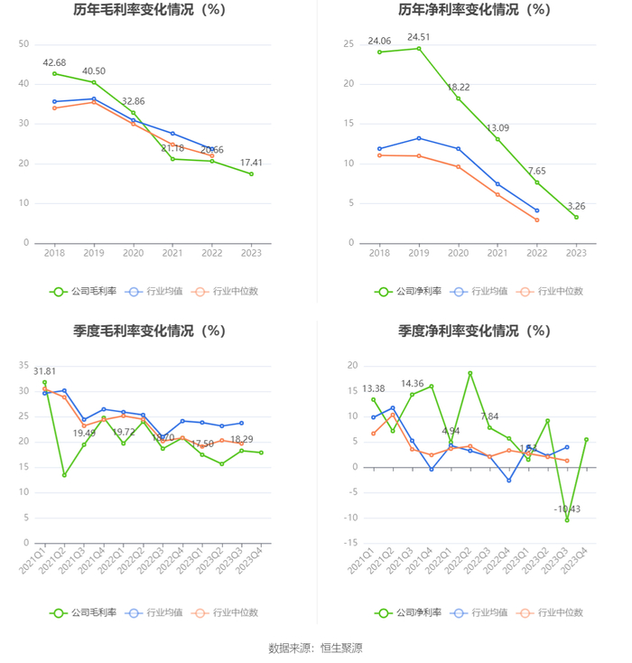 2023年,公司毛利率为17.41%,同比下降3.25个百分点;净利率为3.26%,较上年同期下降4.39个百分点。从单季度指标来看,2023年第四季度公司毛利率为17.92%,同比下降2.91个百分点,环比下降0.37个百分点;净利率为5.51%,较上年同期下降0.20个百分点,较上一季度上升15.94个百分点。