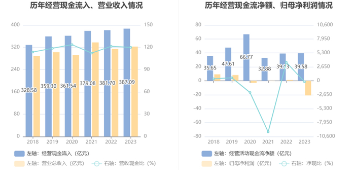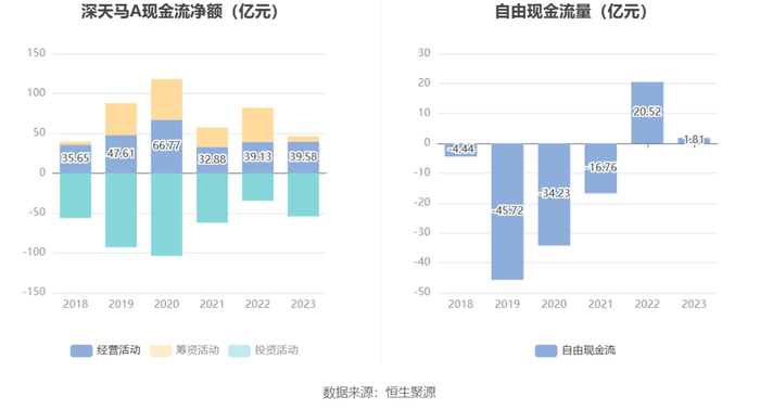 2023年,公司经营活动现金流净额为39.58亿元,同比增长1.15%;筹资活动现金流净额6.84亿元,同比减少36.18亿元;投资活动现金流净额-54.28亿元,上年同期为-34.67亿元。