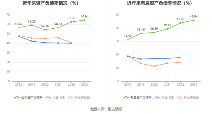 在偿债能力方面,公司2023年年末资产负债率为64.63%,相比上年末上升2.00个百分点;有息资产负债率为46.04%,相比上年末上升2.11个百分点。