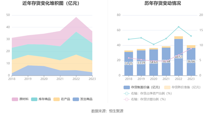 从存货变动来看,截至2023年末,公司存货账面价值为36.66亿元,占净资产的13.11%,较上年末减少11.87亿元。其中,存货跌价准备为3.6亿元,计提比例为8.95%。