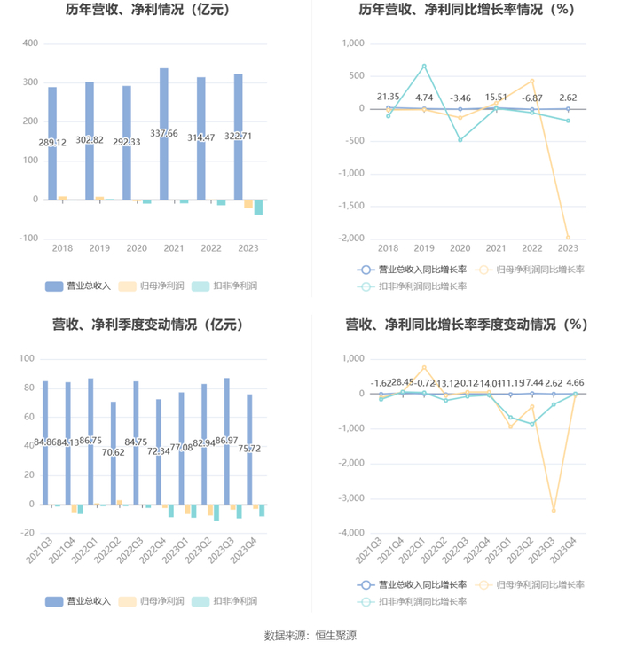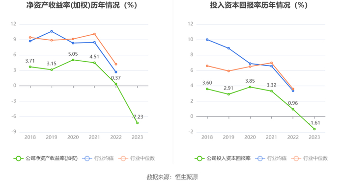 数据显示,2023年公司加权平均净资产收益率为-7.23%,较上年同期下降7.60个百分点;公司2023年投入资本回报率为-1.61%,较上年同期下降2.57个百分点。