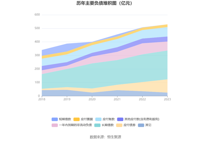 负债重大变化方面,截至2023年年末,公司应付债券较上年末增加45.15%,占公司总资产比重上升3.62个百分点;一年内到期的非流动负债较上年末减少18.87%,占公司总资产比重下降2.00个百分点;长期借款较上年末增加4.18%,占公司总资产比重上升0.74个百分点;应付账款较上年末增加11.04%,占公司总资产比重上升0.75个百分点。