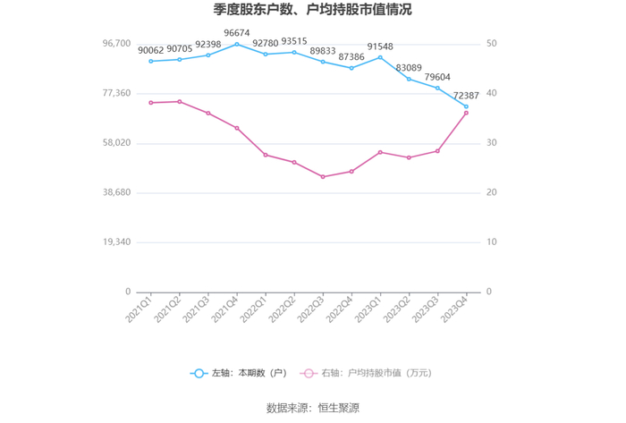 筹码集中度方面,截至2023年年末,公司股东总户数为7.24万户,较三季度末下降了7217户,降幅9.07%;户均持股市值由三季度末的28.47万元上升至36.16万元,增幅为27.01%。