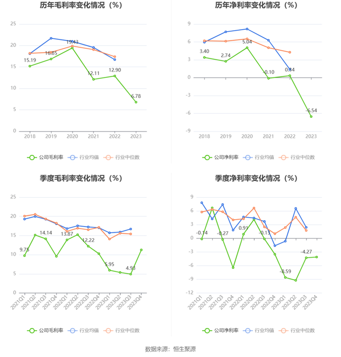 2023年,公司毛利率为6.78%,同比下降6.12个百分点;净利率为-6.54%,较上年同期下降6.88个百分点。从单季度指标来看,2023年第四季度公司毛利率为11.26%,同比上升0.99个百分点,环比上升6.33个百分点;净利率为-4.11%,较上年同期下降0.61个百分点,较上一季度上升0.16个百分点。