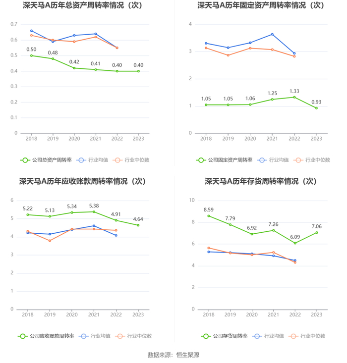 营运能力方面,2023年,公司公司总资产周转率为0.40次,上年同期为0.40次(2022年行业平均值为0.55次,公司位居同行业34/42);固定资产周转率为0.93次,上年同期为1.33次(2022年行业平均值为2.94次,公司位居同行业34/42);公司应收账款周转率、存货周转率分别为4.64次、7.06次。