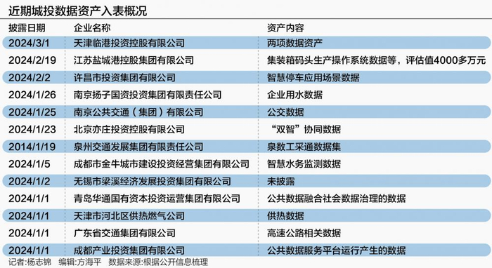 另据记者统计,入表资产以公交、供暖、供水等公共事业数据为主:南京公交集团评估入表的数据资产涵盖了历史公交方面信息以及实时数据等关键资源,成都市金牛城市建设投资经营集团有限公司以内部智慧水务监测数据以及运营数据等城市治理数据作为入表对象,南京扬子国资投资集团以3000户企业用水脱敏数据入表,许昌市投资集团有限公司以智慧停车应用场景数据入表等。