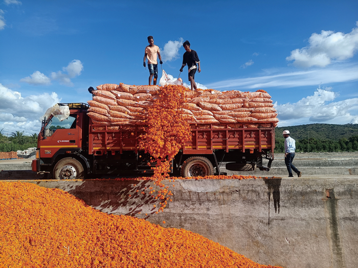 △晨光生物坚持员工当地化,并通过文化融合,将印度员工培养成责任心强的优秀员工。上图为当地花农交售鲜花,下图为万寿菊种植基地。
