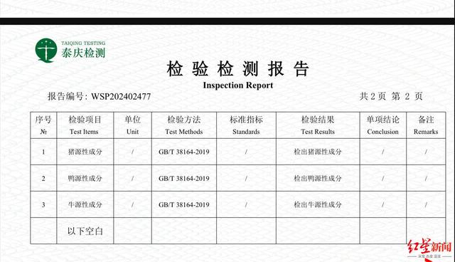 两款检测出猪源性和鸭源性成分