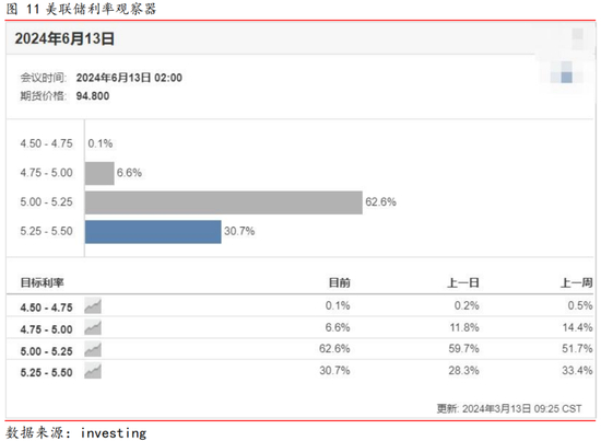 新美联储通讯社”NickTimiraos表示,美国2月CPI数据并没有显著地改变市场对美联储6月加息的预期。截至3月13日,investing数据显示,认为到2024年6月美联储至少降息25个基点的概率为69.3%。
