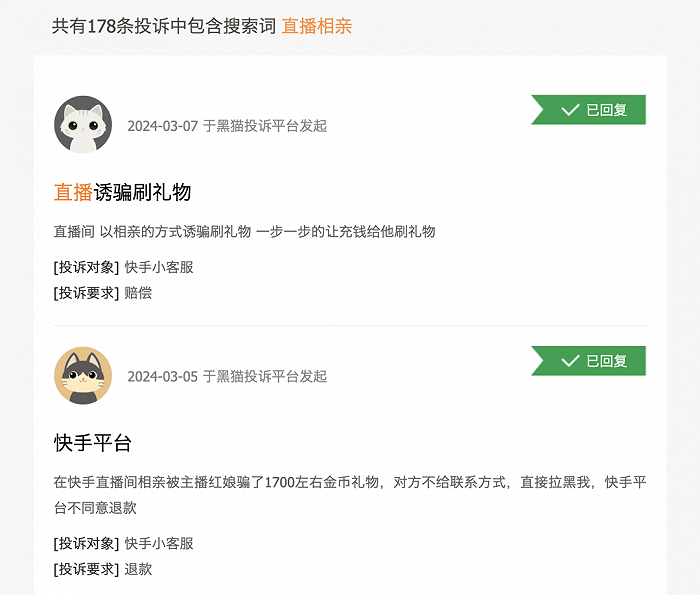 另外,直播相亲的高效也带来了一些麻烦。《半月谈》2024年第二期就提到了少数主播引诱嘉宾“刷礼物”、嘉宾身份造假、诈骗后维权难的情况。而根据经遮掩居所观察,目前在黑猫投诉平台与“直播相亲”词条相关的投诉数量也有上百条,投诉内容则多为主播伙同上麦女嘉宾骗取大量礼物、诱导消费等,涉案金额为几百元到几万元不等。