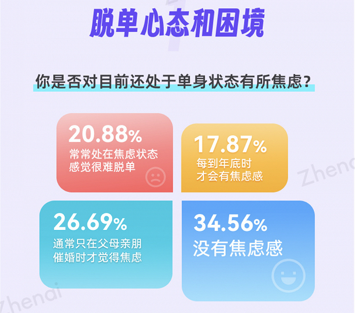 根据珍爱网发布的《2023年Q4单身人群调研报告》显示,只有34.56%处于单身状态的人没有焦虑感,而20.88%的人常常处在焦虑状态感觉很难脱单。因此不少人选择通过父母介绍、网上交友来提高脱单几率。