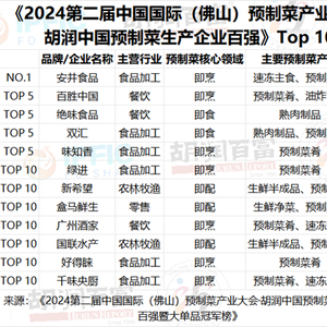 (2024年3月15日,广东佛山)胡润研究院携手中国国际(佛山)预制菜产业大会组委会联合发布《2024第二届中国国际(佛山)预制菜产业大会·胡润中国预制菜生产企业百强暨大单品冠军榜》(The 2nd International Pre-cooked Food Industry Conference (Foshan, China) · Hurun China Pre-cooked Food Businesses Top 100 & Category Champions 2024),榜单列出了预制菜领域最具实力的中国百强企业,并从去年的四个级别增加至六个级别,分为第一名、5强、10强、30强、50强和100强。这是胡润研究院第二次发布该榜单。