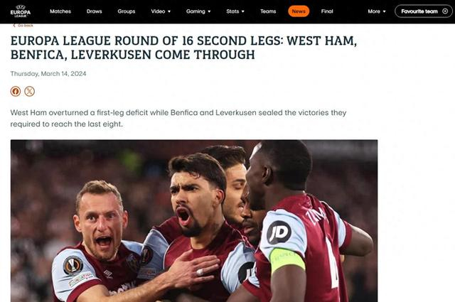 至此,本赛季欧联杯八强全部产生,他们是法甲马赛队、葡超本菲卡队、英超西汉姆联队、意甲AC米兰队、英超利物浦队、意甲罗马队、意甲亚特兰大队、德甲勒沃库森队。