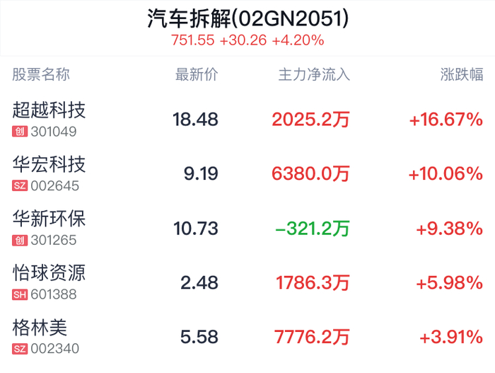 受此影响,汽车拆解/汽车整车连续走强,其中超越科技两日20%涨停,股价累计涨44%,华宏科技2连板,怡球资源、东江环保、格林美等跟随涨停。
