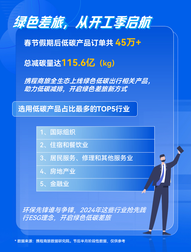 通过引入低碳理念,携程商旅上线全生态绿色低碳出行产品,助力越来越多企业开启绿色差旅新方式。节后半月差旅低碳产品订单超过45万单,总减碳量达115.6亿(kg),低碳产品订单占比环比上月同期增长超2个百分点。