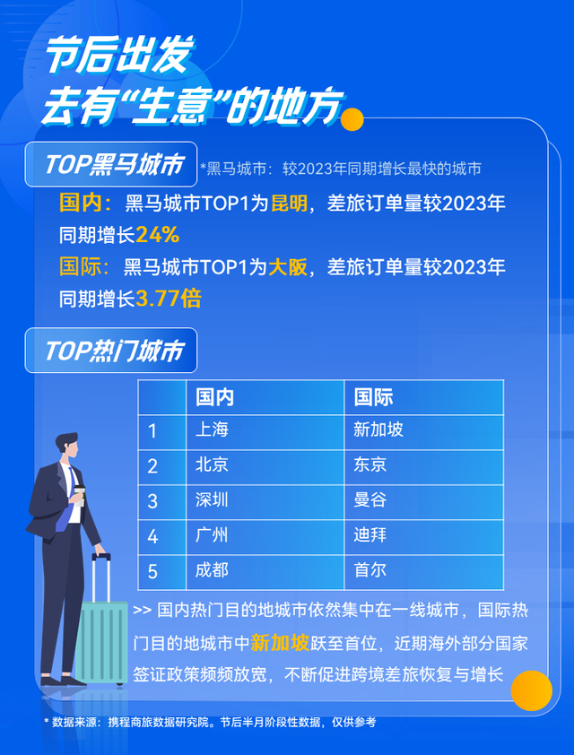 值得一提的是,今年开工后昆明成为差旅黑马目的地TOP1,差旅订单量较去年同期增长24%。开工季下沉市场展现出蓬勃发展的势头,宜宾、西宁、十堰、邢台、泸州成为各大企业发力下沉市场的“新风口”。