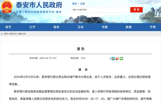 3月13日,山东省泰安市人民政府发布通告表示,3月12日以来,泰安银行部分营业网点储户集中办理业务,由于人员较多、业务量大,出现办理过程较慢等现象。泰安银行是经国家金融监督管理总局批准成立的合法金融机构,是人民银行存款保险的投保单位,资金雄厚,经营良好,具备保障人民群众存款安全的综合实力。