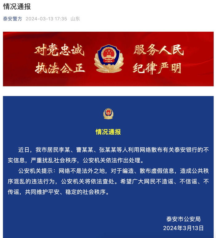 同日,泰安市公安局发布情况通报显示,近日,泰安市居民李某、曹某某、张某某等人利用网络散布有关泰安银行的不实信息,严重扰乱社会秩序,公安机关依法作出处理。
