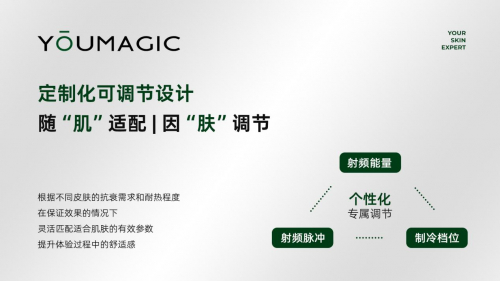 从技术追赶到引领跨越,在医疗器械国产替代背景下,YOUMAGIC高能单极射频凭借颠覆式技术创新竞争力,或将改变医美产业发展格局。YOUMAGIC高能单极射频敏锐洞悉医美上下游领域的舒适性感受痛点和合规化品相刚需,突破性采用定制化可调节技术,能够根据不同肌肤的紧致需求和耐热程度,针对性匹配射频能量、射频脉冲、制冷档位三大射频参数,让每个用户都能在适合自己的有效能量中舒适体验,用技术实力构建起医美赛道竞争壁垒。