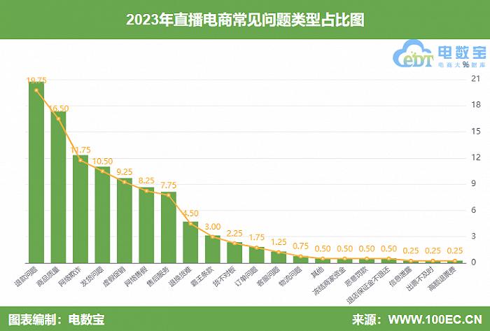 2023年的直播电商问题更加凸显,“翻车”事件时有发生,涉嫌售假、虚假宣传等主播往往站在风口浪尖。据“电诉宝”受理用户维权案例显示,退款问题、商品质量、网络欺诈、发货问题、虚假促销、网络售假、售后服务、退换货难、霸王条款、货不对板、订单问题、客服问题、物流问题等为2023年直播电商常见问题。